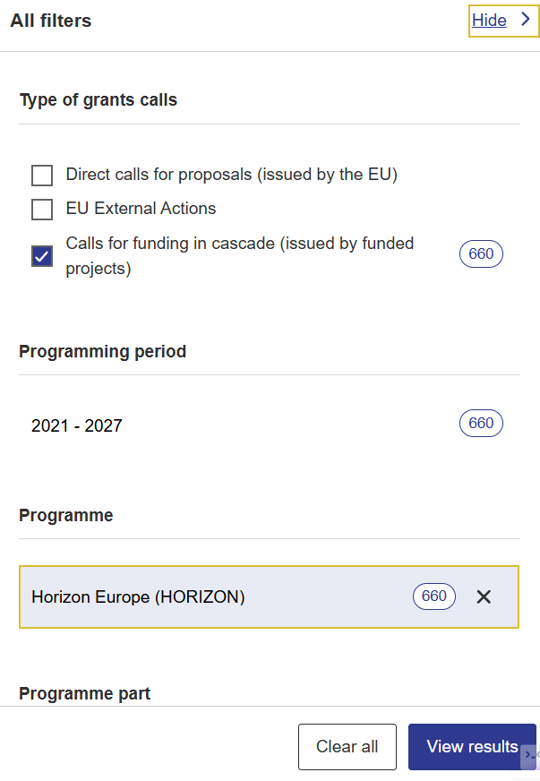 - Wählen Sie den Filter „Calls for funding in cascade (issued by funded projects)“.